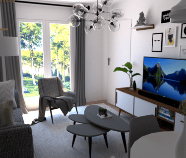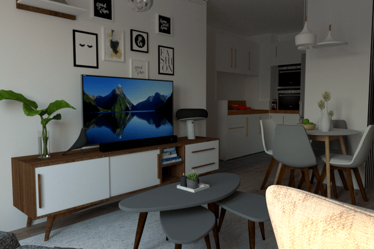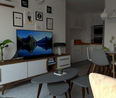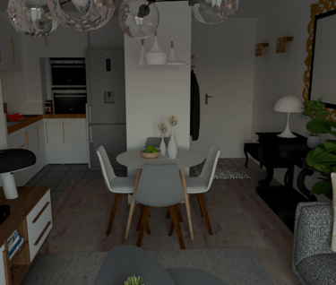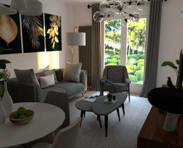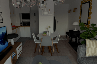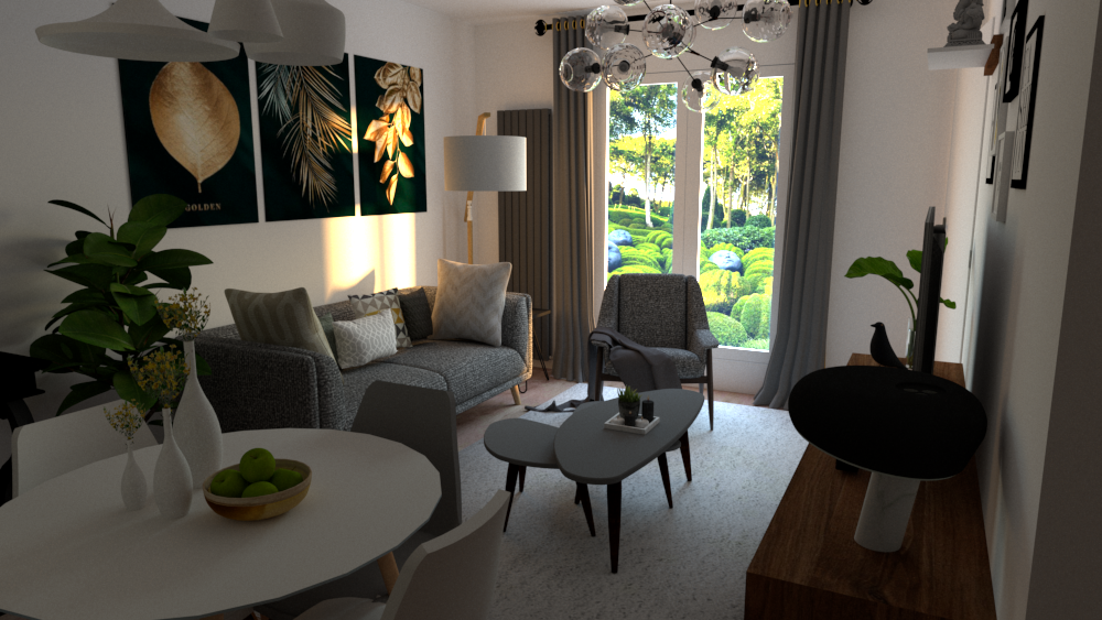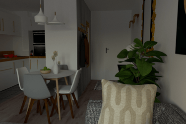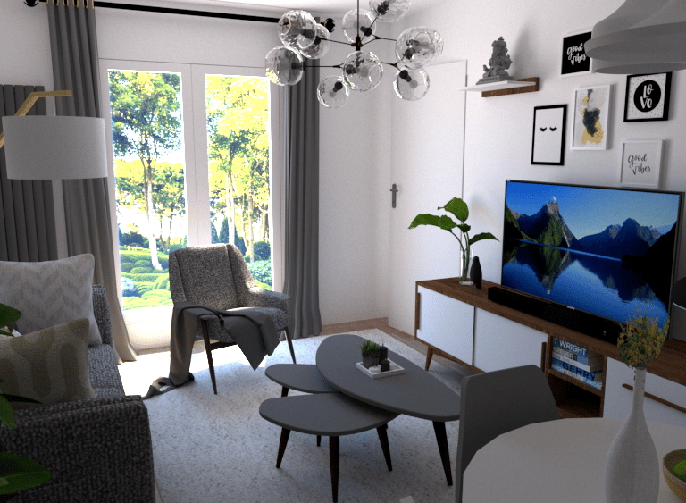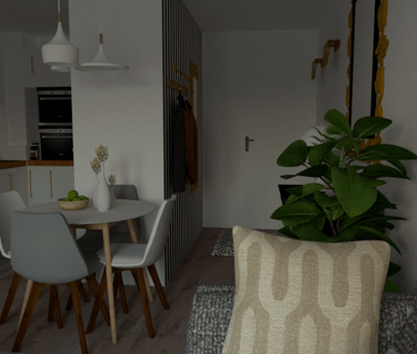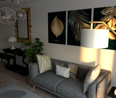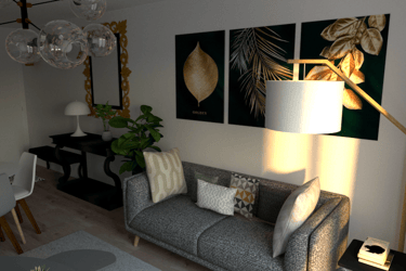 L'appartement Joa laisse place à la sobriété et à l'élégance. Le mariage du gris, du blanc et du vert souligne la forme et les matériaux du mobilier et des accessoires. La petite touche d'éléments dorés vient sublimer l'environnement intérieur du séjour et de l'entrée.