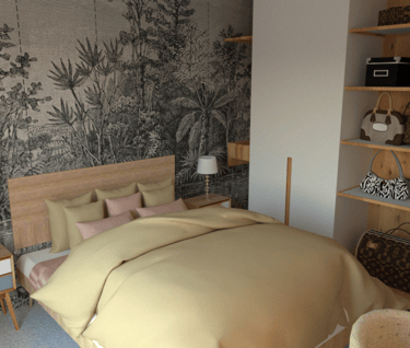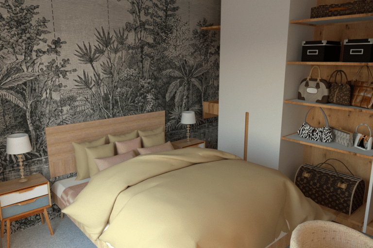 La chambre, destinée à une femme, est un espace spécial lui permettant de se détendre et d'exprimer sa personnalité. Le dressing est un élément essentiel de cette pièce, offrant un espace de rangement pour ses vêtements et accessoires. Pour créer une atmosphère unique, le choix du papier peint est crucial. Le motifs floral tropical en noir et blanc ajoute une touche de style et d'élégance à la chambre.